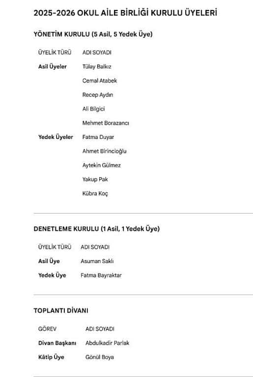 2025-2026 OKUL AİLE BİRLİĞİ KURUL ÜYELERİ